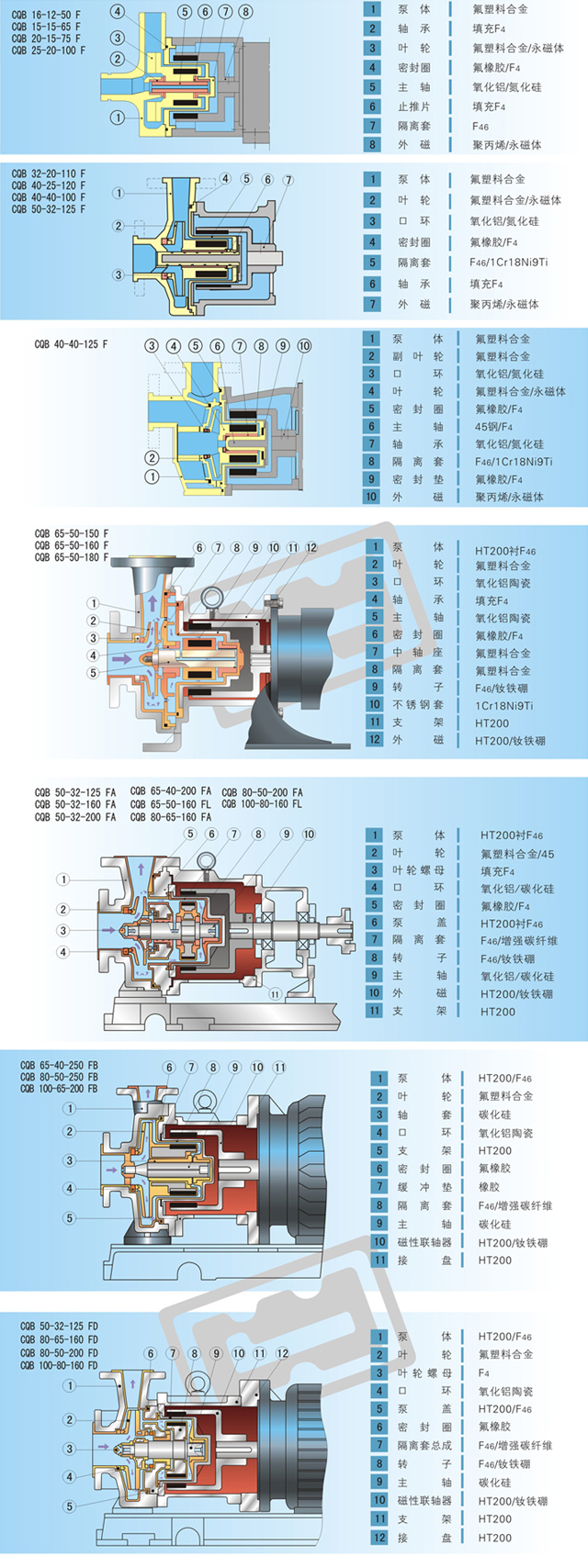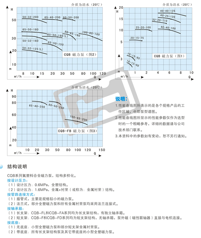 由于泵的過流部分選用“氟塑料合金”制造?蛇B續(xù)輸送任意濃度的酸、堿、強氧化劑等腐蝕介質(zhì)而毫不受損。