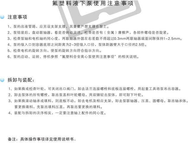 FYH型氟塑料液下泵是長(zhǎng)軸式立式離心泵,其接觸液體部分全部由氟塑料合制而成,具有耐腐蝕范圍廣、效率高、重量輕、不需要灌液即能抽送、維修方便等特點(diǎn)。