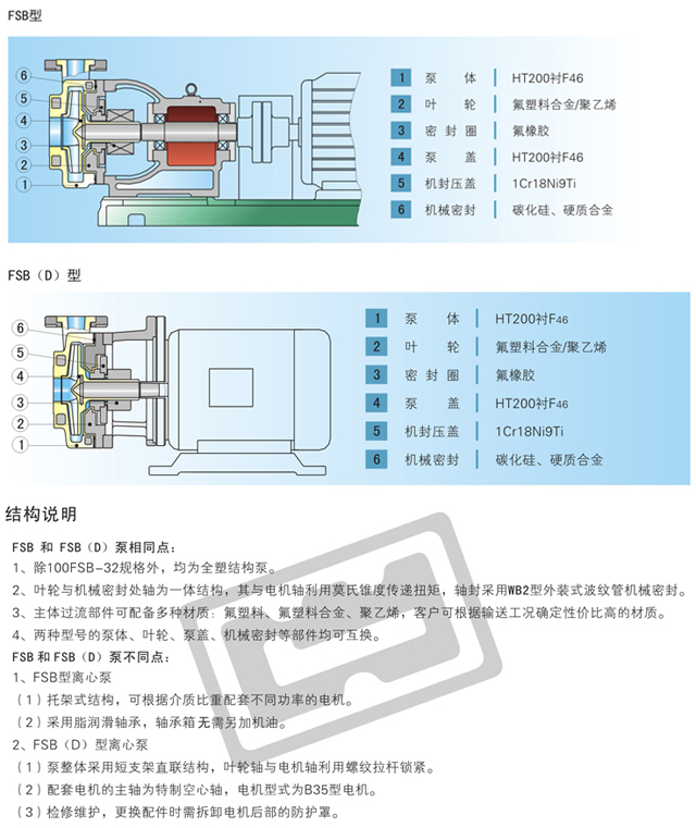 FSB和FSB-D型離心泵,過流部件全部采用氟塑料合金制造結(jié)構(gòu)緊湊、操作簡單、價格低廉。兩種型號的泵殼、葉輪、機封等均可互換使用,深受農(nóng)藥、電子、造紙等行業(yè)的歡迎。